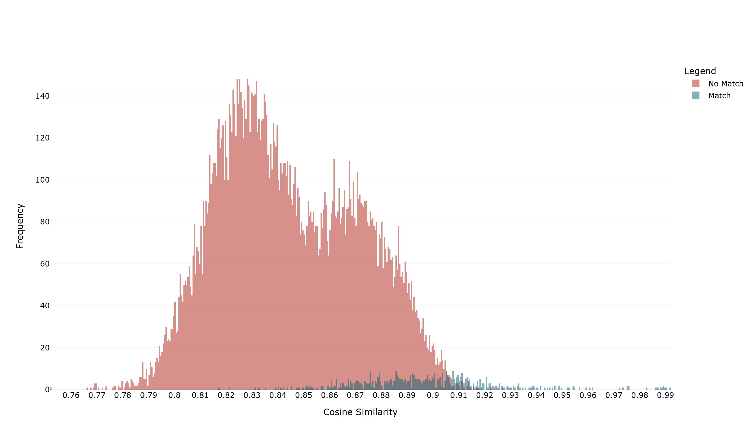 The following figure depicts how well matches and mismatches in the test data are separated by the model. For results with a minimum of false positives, a threshold higher than 0.91 is recommended. For the optimal F1 score, the right treshold is 0.9050.